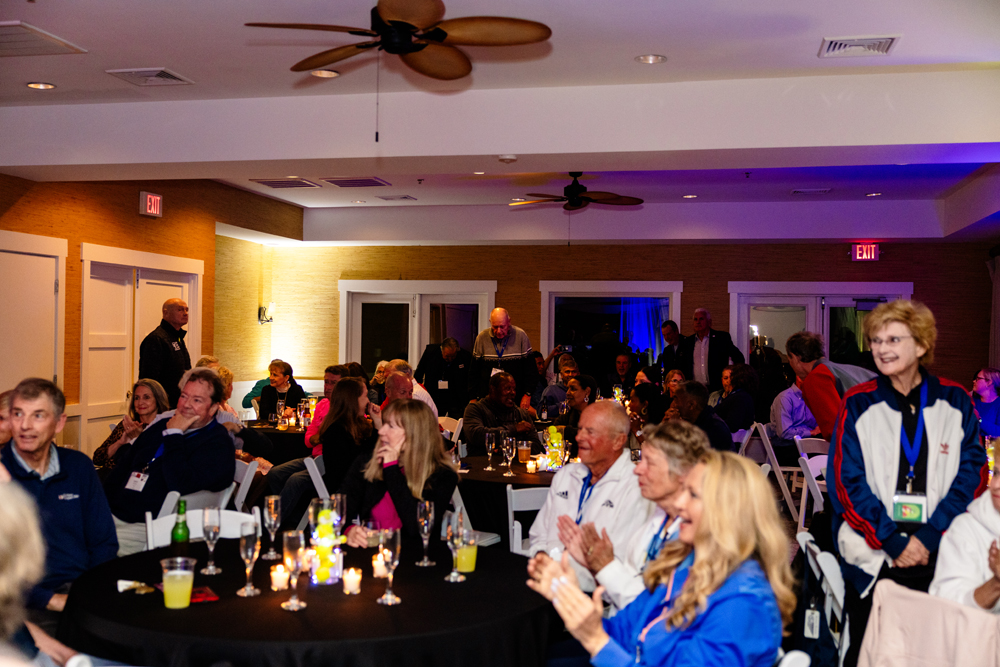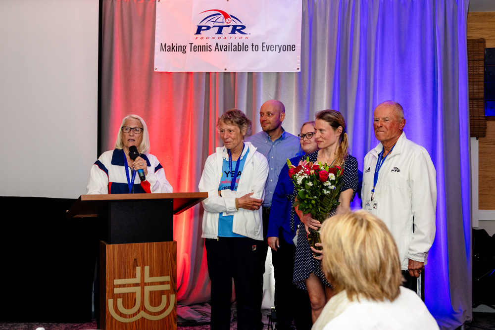 As Scott Mitchell acted as the audience facilitator, friends and family made the awards dinner on Friday night truly memorable by sharing their amusing personal stories about Dennis. Dr. Jim Loehr’s heartfelt video, a tribute to Dennis’s remarkable contributions throughout his life, set the tone for the evening. Lynne Salus’s beautiful centerpiece added to the perfect atmosphere. After John Raker’s speech about Dennis in the Hall of Fame, Louie and Ajay toasted with champagne to honor Dennis’s highest award. Jean Mills presented Helma with the Lifetime Achievement Award in recognition of her 50 years of dedication and passion for the PTR. She was the highlight of the evening, delivering an outstanding speech about her experiences at the PTR. Jack Barker then announced Samir Mahir, the President of the Blind Tennis Association, as the recipient of the Dennis and Pat PTR Foundation Humanitarian Award for his commitment to bringing tennis to visually impaired and low-vision athletes.